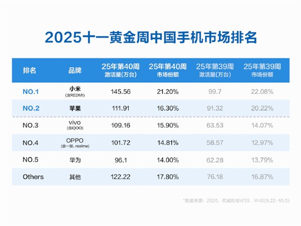据排名榜单,十一黄金周期间,中国市场手机销量排名前五品牌分别为小米、苹果、vivo、OPPO、华为。